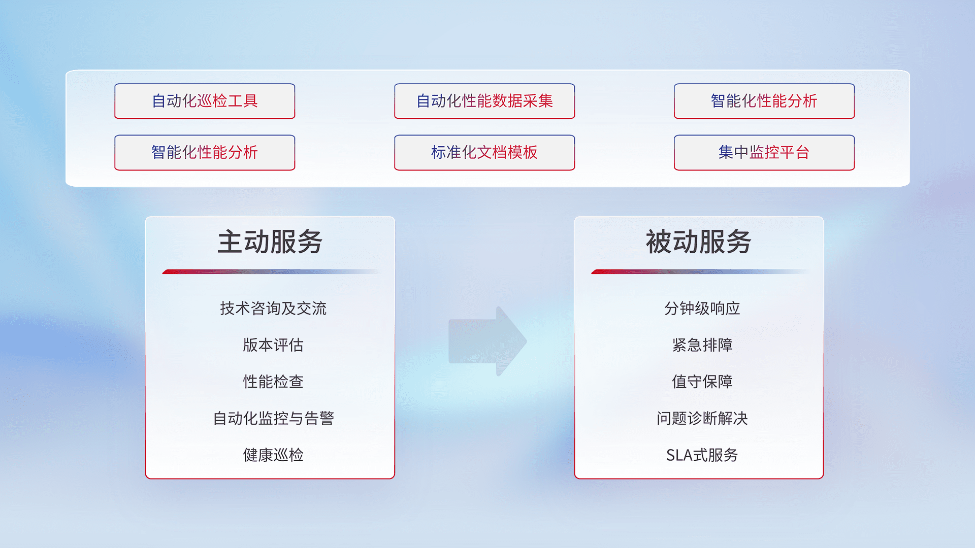 智能化工具和标准化文档,,保障服务质量,,提供主动服务(包含技术咨询、、、、版本评估、、、性能检查、、、自动化监控与告警、、、健康巡检)和被动服务包含(分钟级响应、、、、紧急排障、、、值守保障、、、、问题诊断解决、、SLA服务)。。。。
